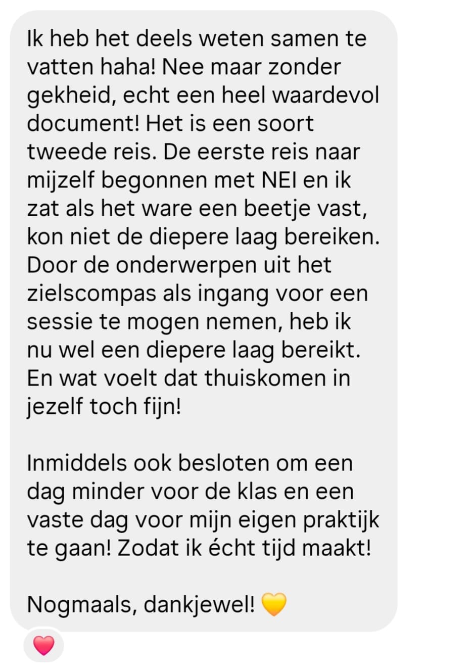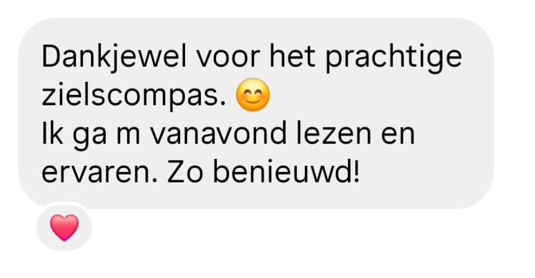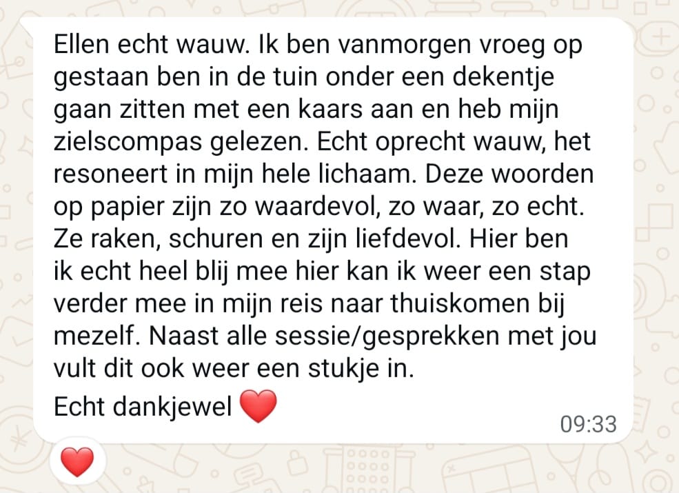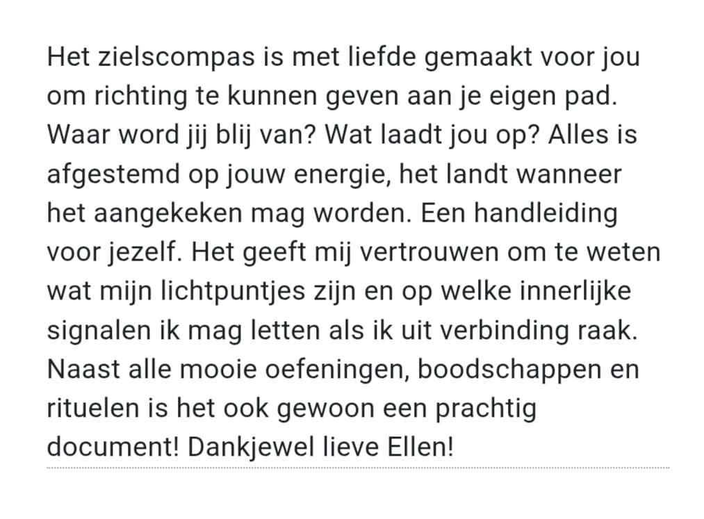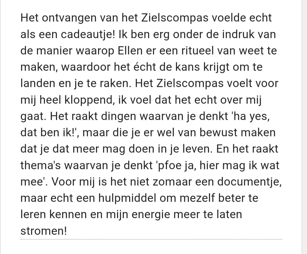 “Wat een cadeautje om mijn zielscompas te mogen ontvangen! Het is een heel waardevol en compleet document waar ik nog regelmatig op terug ga vallen!”