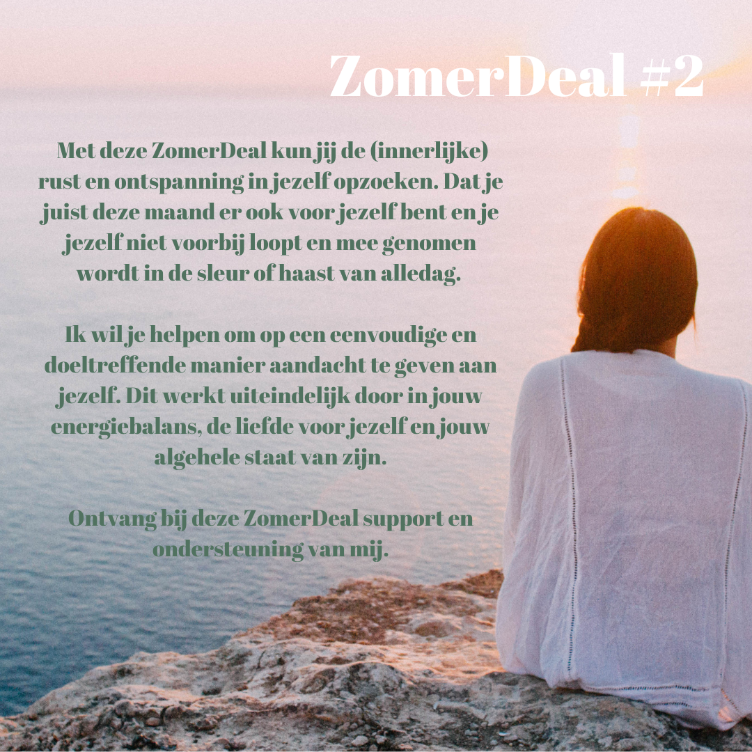 Wat ik je wil bieden: ik wil waarde toevoegen aan jouw zomermaanden (lees: juli en augustus), zodat jij de (innerlijke) rust en ontspanning in jezelf kunt opzoeken. Dat je juist deze maanden er ook voor jezelf bent en je jezelf niet voorbij loopt en mee genomen wordt in de sleur of haast van alledag. Ik wil je helpen om op een eenvoudige en doeltreffende manier aandacht te geven aan jezelf. Dit werkt uiteindelijk door in jouw energiebalans, de liefde voor jezelf en jouw algehele staat van zijn.